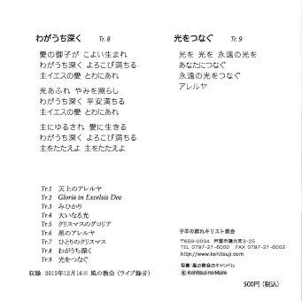 クリスマス物語のCDには収録されていない、「みひかり」、「わがうち深く」、「Gloria in Excelsis Deo」、イザヤ9章2、6節「大いなる光」他、クリスマスのさんびが収録されています。