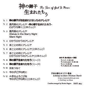 「ひかりひかりのアレルヤ」 「星月夜のアレルヤ」 「神の御子生まれたもう」 「まことの光にアレルヤ」 「神の御子がお生まれになったのアレルヤ」 「大きなよろこびを」など全12曲が1枚に収められています。